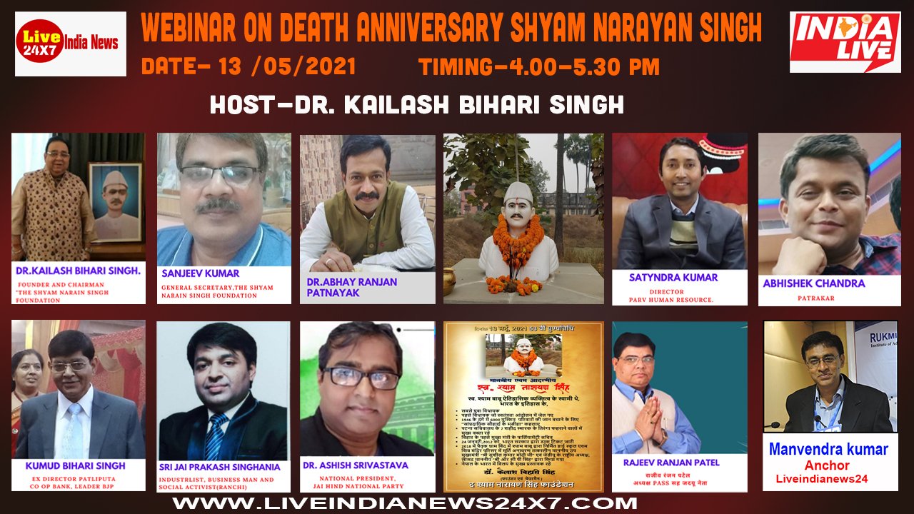 महान स्वतंत्रता सेनानी, पूर्व विधायक, समाजसेवी, शिक्षा विद एवं सांप्रदायिक सौहार्द के मसीहा श्याम नारायण सिंह की 53 वीं पुण्य तिथि पर खास वेबिनार का आयोजन 13 मई 2021 को किया गया है जिसमें देशभर के कई विशिष्ट व्यक्तित्व अपने विचार रखेंगे। इस आयोजन के बारे में श्याम नारायण सिंह फाउंडेशन के फाउंडर व चेयरमैन डॉ. कैलाश बिहारी सिंह ने बताया कि इस तरह के आयोजन से जहां हम श्याम नारायण सिंह को याद करेंगे वहीं उनके विचार को आगे बढ़ाने का कार्य भी किया जा रहा है। श्याम नारायण सिंह ने समाज में हर वर्ग के विकास के लिए कार्य किया है इसी को आज के युवाओं को जानने की जरूरत है। इस खास वेबिनार के बारे में बताते हुए डॉ कैलाश बिहारी सिंह ने बताया कि यह वेबिनार करीब डेढ़ घंटे का होगा ओर जरूरत पड़ने पर इसकी अवधि बढ़ाई जा सकती है। हमारी कोशिश है कि देश भर के लोगों को इस वेबिनार में अपने विचार रखें। दिल्ली, पटना, लखनऊ, भूवनेश्वर जैसे कई शहरों से लोग जुड़ेंगे।