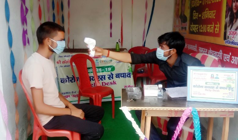खैर के गांव पला चांद में कोरोना महामारी से बचाव के लिए हेल्प डेक्स पर ग्रामीणों का चेकअप किया गया।