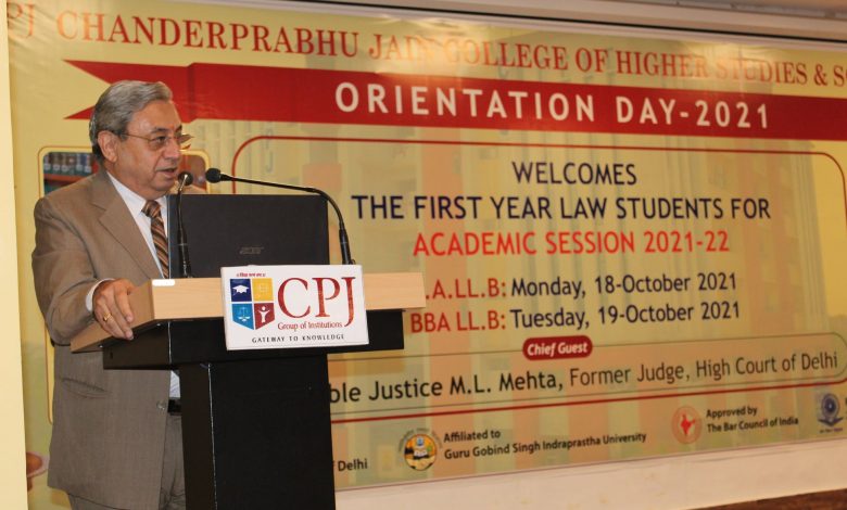 सीपीजे कॉलेज में दो दिनों का ओरिएंटेशन कार्यक्रम का आयोजन किया गया। जिसे संबोधित करते हुए दिल्ली उच्च न्यायालय के पूर्व जज एमएल मेहता ने कहा कि छात्रों को यह अपनाना होगा कि लॉ इज लाइफ। तभी आप सफल होंगे। आज लॉ के छात्रों के लिए कई अवसर हैं, बस पहचानने की जरूरत है।