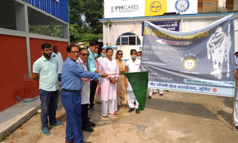 वैश्विक आयोडिन अल्पता बचाव दिवस के अवसर पर सदर अस्पताल मुंगेर से लेकर हेल्थ एंड वेलनेस सेंटर तक जागरूकता कार्यक्रम आयोजित किए गए। सदर अस्पताल में भोजन में आयोडिन युक्त नमक का इस्तेमाल करने और आयोडिन युक्त खाद्य पदार्थ के इस्तेमाल के प्रति लोगों को जागरूक करने के उद्देश्य से एएनएम स्कूल की छात्राओं द्वारा निकाली गई जागरूकता रैली को सिविल सर्जन डॉ. हरेन्द्र आलोक, डीपीएम नसीम रजि और एनसीडीओ डॉ. के. रंजन ने हरी झंडी दिखाई। जागरूकता रैली सदर अस्पताल से निकलकर विभिन्न मार्गों से होते हुए पुनः सदर अस्पताल पर आकर समाप्त हो गई। इस दौरान एएनएम स्कूल की छात्राएं मानव जीवन में आयोडिन के महत्व के बारे में लोगों को जागरूक करने के नारे भी लगा रही थी ।जैसे खाने- पीने में आयोडिन का करें इस्तेमाल, गवाइटर जैसी बीमारियों से पाएं निजात ! इस अवसर पर एएनएम स्कूल की प्रभारी प्राचार्य रागिनी कुमारी, लेखापाल उत्तम केशरी, एनसीडी कार्यालय की राखी मुखर्जी, नितिन कुमार, राहुल कुमार और राजीव कुमार सहित कई अन्य लोग उपस्थित थे।