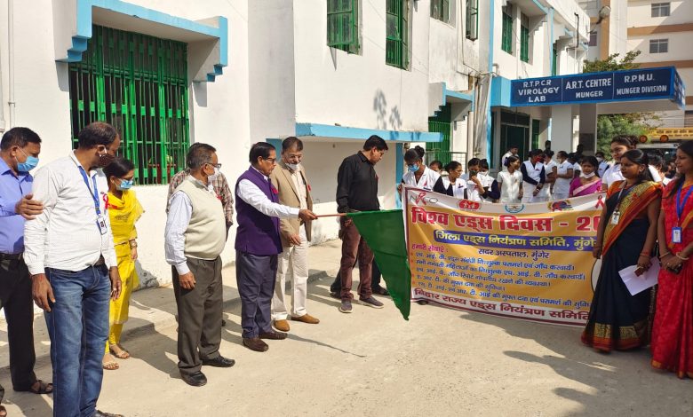 विश्व एड्स दिवस पर बुधवार को एआरटी सेंटर मुंगेर से एएनएम स्कूल की शिक्षिकाएं , छात्राओं सहित स्वास्थ्य विभाग के अधिकारी और कर्मचारियों ने जागरूकता रैली निकाली| जिसे मुंगेर के सिविल सर्जन डॉ. हरेन्द्र कुमार आलोक, डीपीएम नसीम रजि, सीडीओ डॉ. ध्रुव कुमार सहित कई अधिकारियों ने हरी झंडी दिखाई। जागरूकता रैली एआरटी सेंटर से निकल कर एक नंबर ट्रैफिक तक गई और पुनः एआरटी सेंटर लौट कर समाप्त हो गई। इस अवसर पर मुंगेर सदर अस्पताल के उपाधीक्षक प्राण मोहन सहाय, एआरटी सेंटर के नोडल अधिकारी डॉ. ध्रुव कुमार, एनसीडी विभाग के मनोचिकित्सक सलाहकार नितिन आंनद, टीबी विभाग के सभी अधिकारी और कर्मचारी, एएनएम स्कूल की प्रभारी प्राचार्य रागिनी कुमारी सहित स्वास्थ्य विभाग के कई अधिकारी और कर्मचारी उपस्थित थे। इसके साथ ही हेल्थ एन्ड वेलनेस सेंटर इटहरी, नॉवागढ़ी मुंगेर में भी सीएचओ अर्चना कुमारी के नेतृत्व में पोस्टर प्रजेंटेशन के माध्यम से लोगों को एचआईवी के बारे में जागरूक किया गया। इस अवसर पर सीएचओ अर्चना कुमारी के अलावा एएनएम मालती कुमारी और आशा कार्यकर्ता ममता और विशाखा कुमारी भी उपस्थित थी। मालूम हो कि एचआईवी एक गंभीर बीमारी है जिसका वर्तमान में कोई उपचार उपलब्ध नहीं है। इसे आम बोलचाल कि भाषा में एड्स यानि एक्वायर्ड इम्यूनो डेफिशिएंसी सिंड्रोम कहा जाता है। एड्स बीमारी के लिए जागरुकता फैलाने के उद्देश्य से ही प्रत्येक साल विश्व एड्स दिवस 1 दिसंबर को पूरी दुनिया में मनाया जाता है। एड्स पीड़ित मरीजों से हो रहे भेदभाव को दर्शाने के लिए “एंड इनइक्वेलिटी, एंड एड्स” को इस साल के विश्व एड्स दिवस के थीम के रूप में चुना गया है।