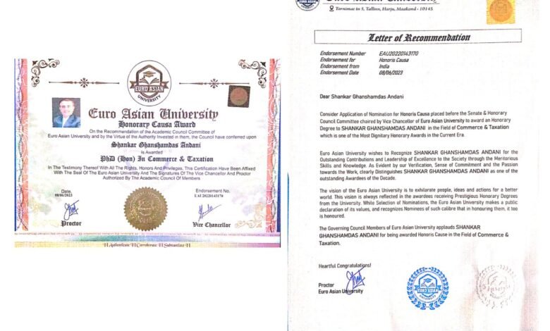 *सीए डॉ. शंकर घनश्यामदास अंदानी को 3 अंतर्राष्ट्रीय विश्वविद्यालयों से मानद डॉक्टरेट की उपाधि प्राप्त हुई।*